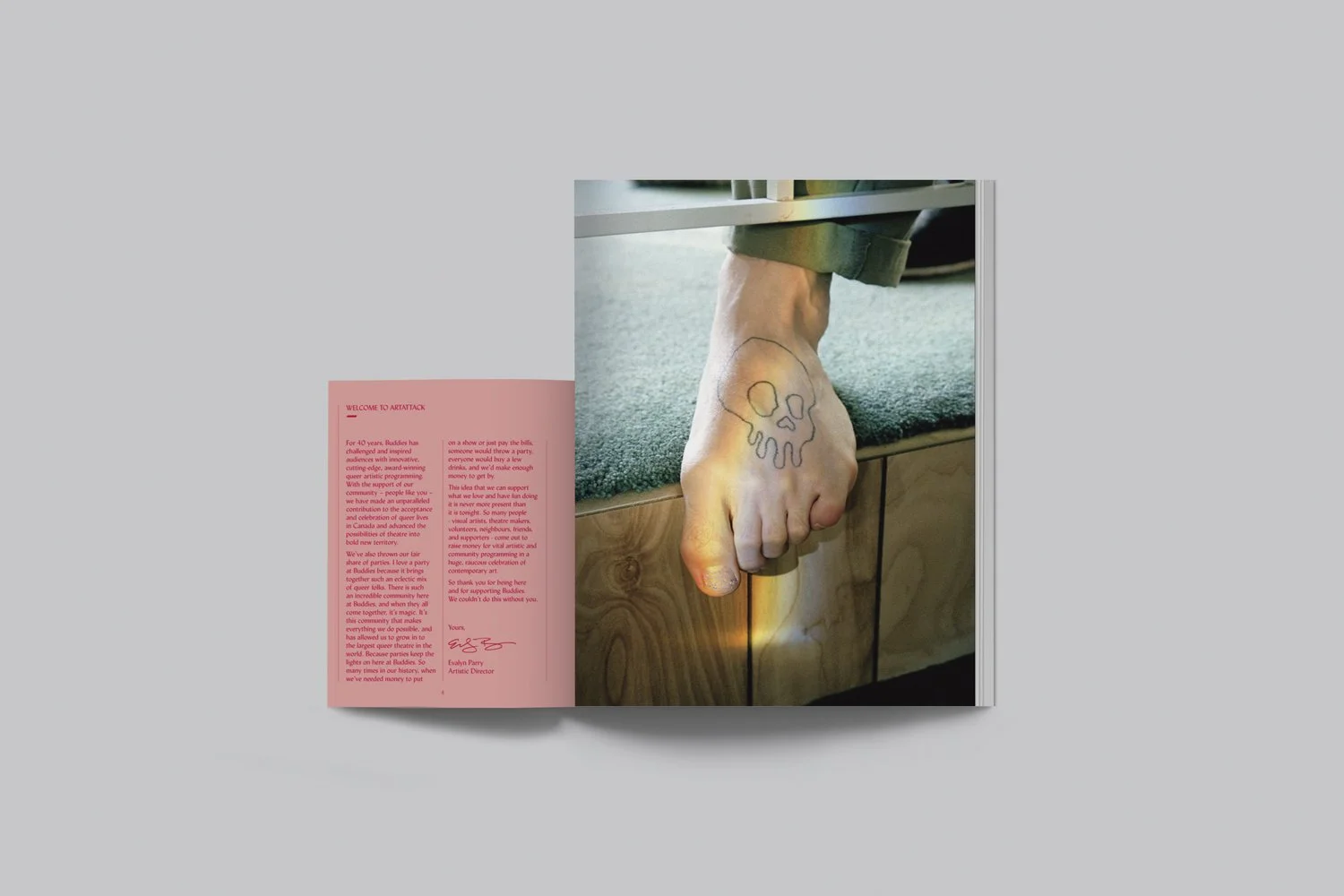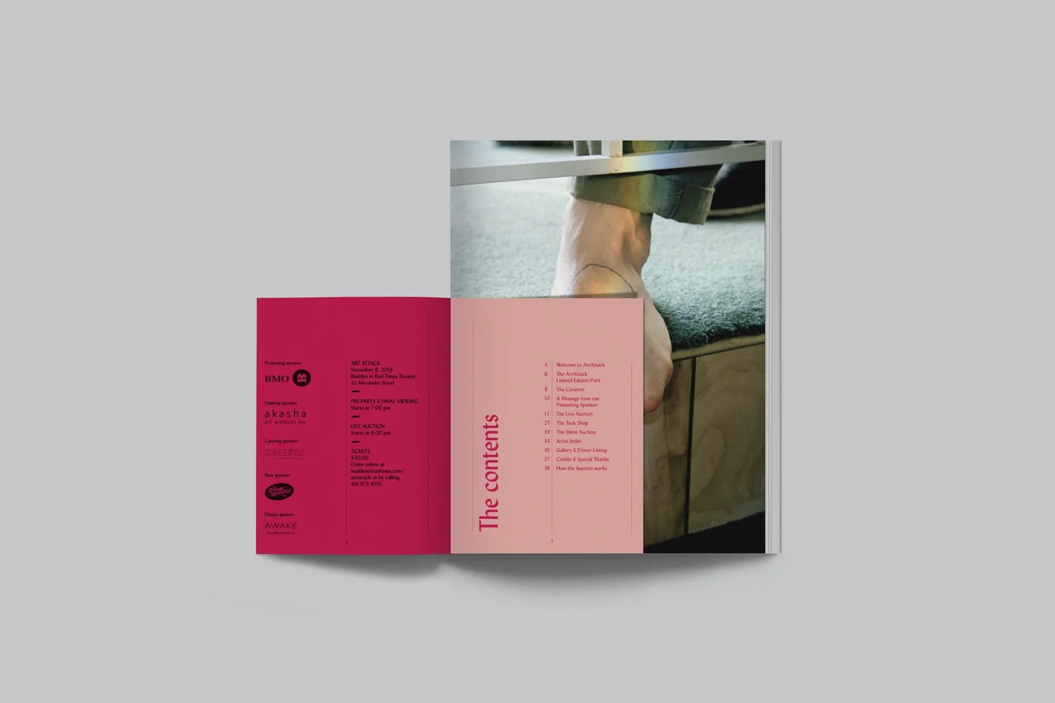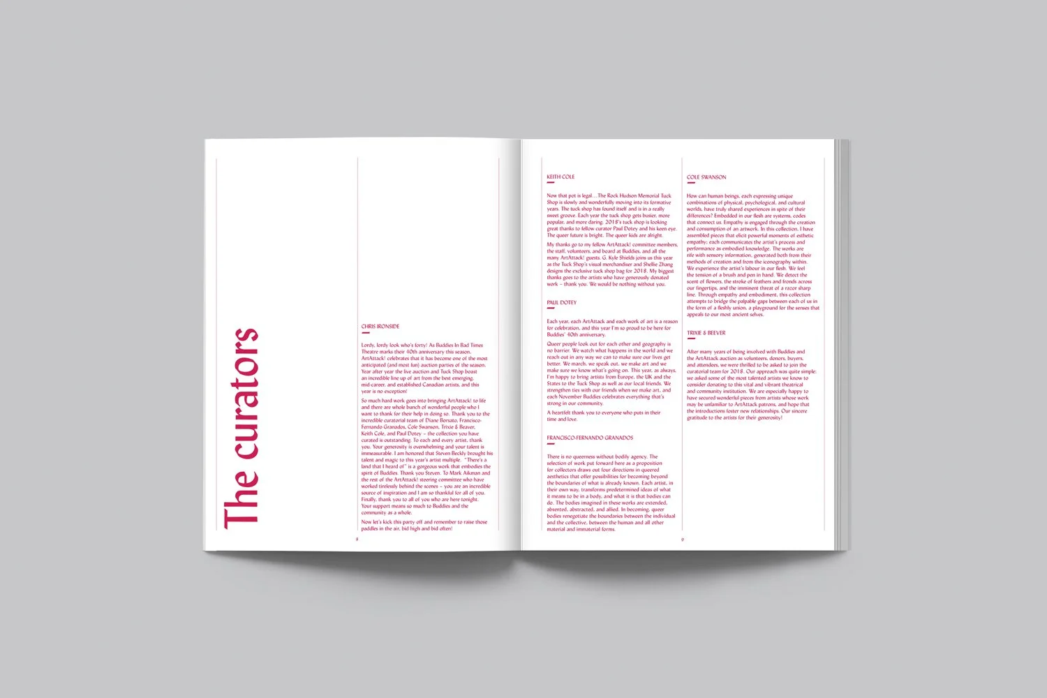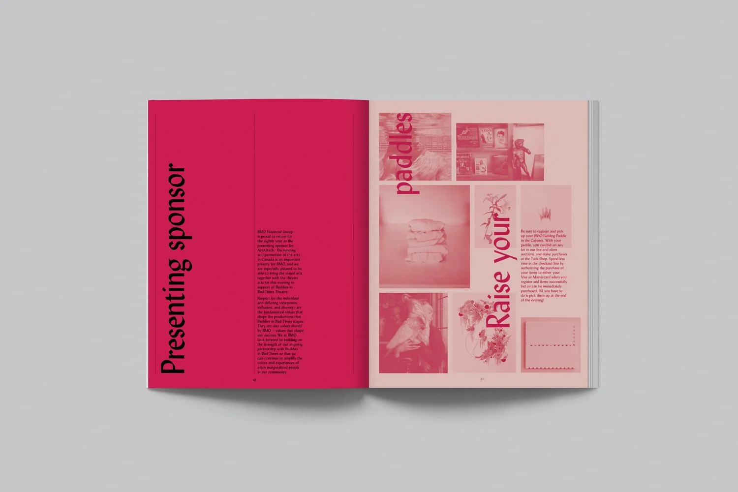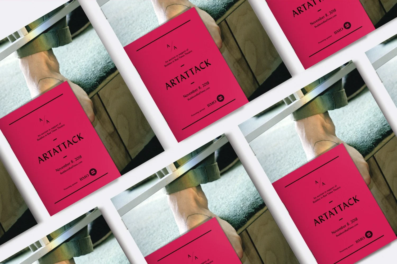 Thursday, November 9 marked another ArtAttack at Buddies in Bad Times Theatre - their annual fundraiser for the long-running Toronto landmark. We were honoured to have created the event branding for the second year in a row. The event is exuberant and highly anticipated and the identity, and especially the programme, needed to live up to the hype as well as provide an appropriate showcase for the work on auction – particularly the Steven Beckly multiple. Using the stunning prismatic gradient on the Beckly piece as a starting point, we amped up the palette and employed a show-stopping gradient to create a programme that's worth keeping even after the event is over.