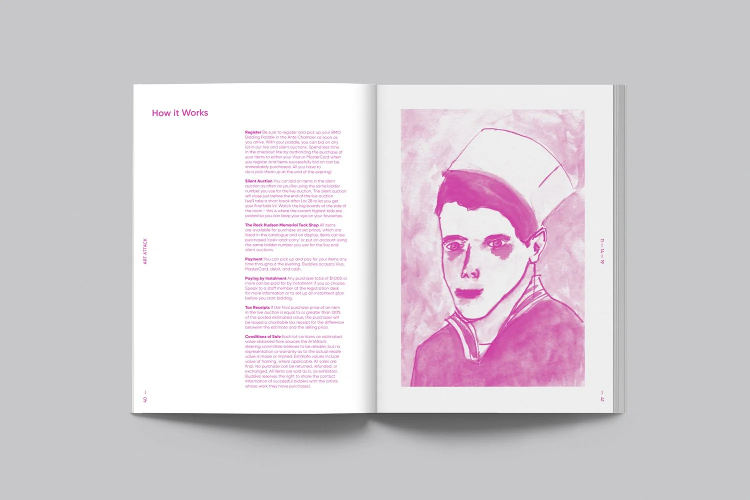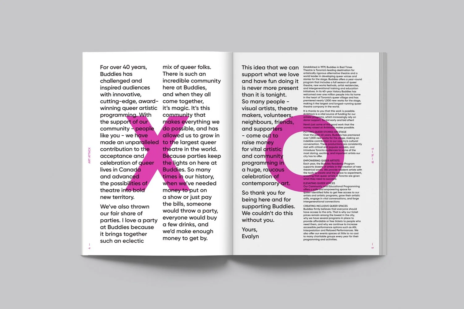 Thursday, November 14 marked another ArtAttack at Buddies in Bad Times Theatre - their annual fundraiser for the long-running Toronto landmark. We were honoured to create the event branding for the third year in a row – a trilogy! The event is exuberant and highly anticipated and the catalog needed to live up to the hype. For the first time in a long time the event multiple wasn’t going on the cover which gave us the opportunity to design a blank canvas, along with Buddies’ eye-catching pink brand colour to create a programme that's worth keeping even after the event is over.