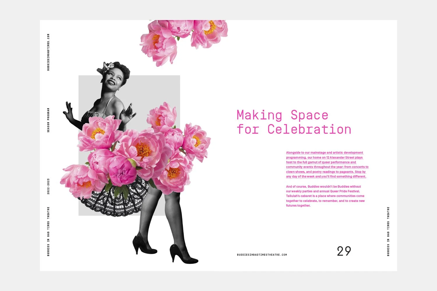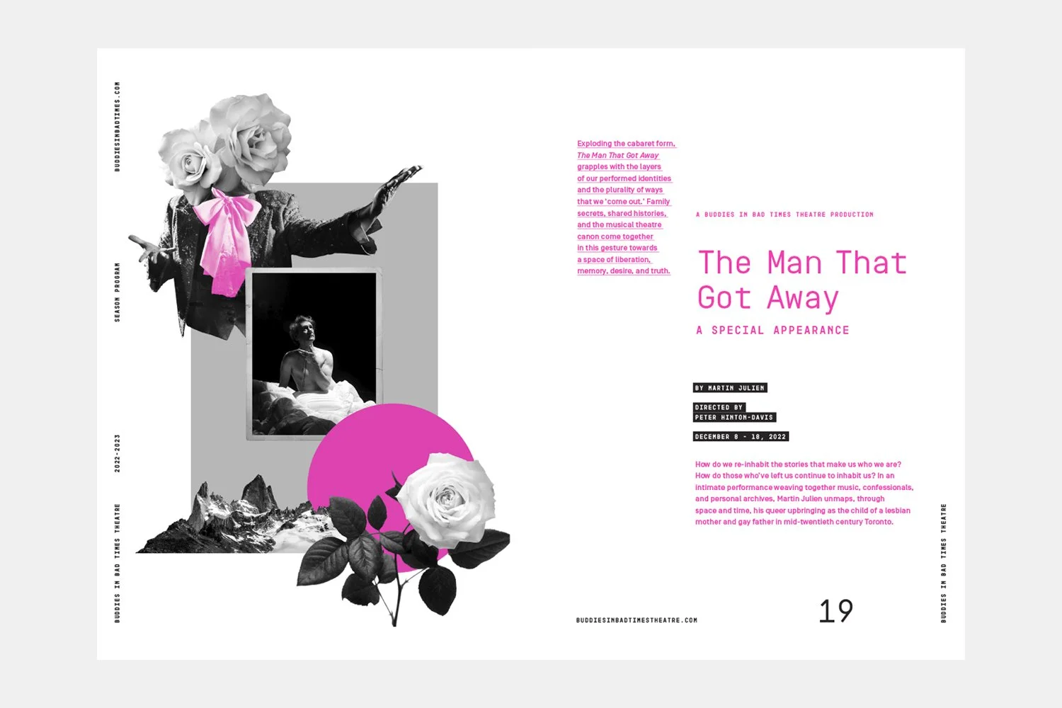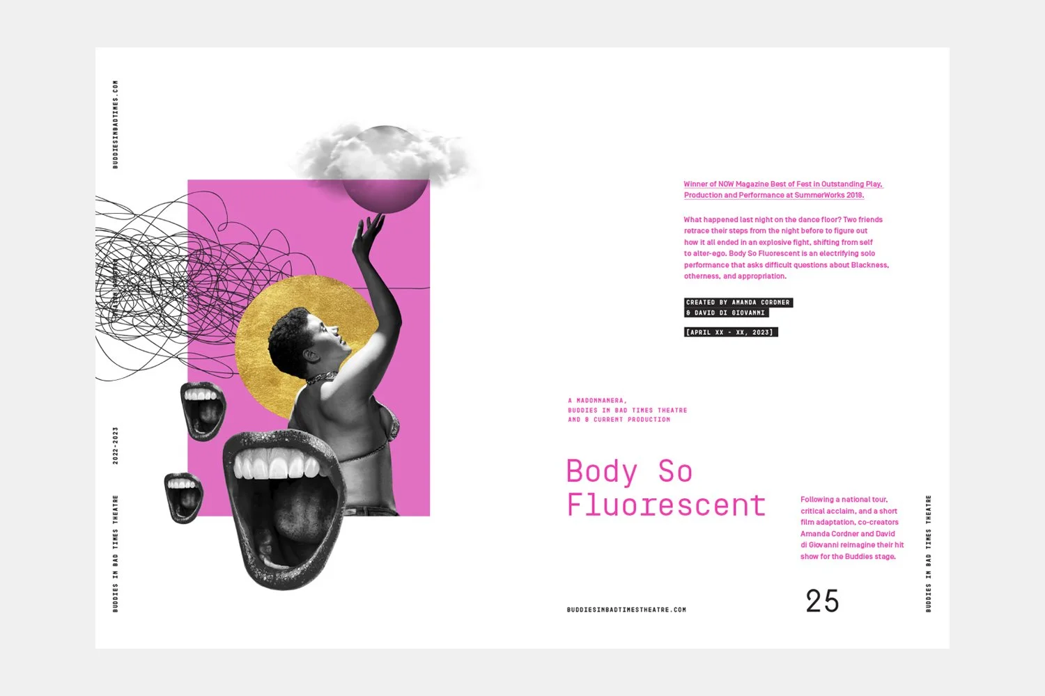 This season the theatre was “exploring how moments of connection blend together” and what is Buddies’ role “in both local and international performance ecologies.” History also became a central theme and conversations centred around how the past is honoured while concurrently creating new paths forward. A collage approach was established as a way to create a dynamic and visually impactful campaign which allowed for rich storytelling within each image. Pink, the theatre’s primary palette colour, was woven through the campaign imagery to create a sense of connection between collages and to the established Buddies brand.