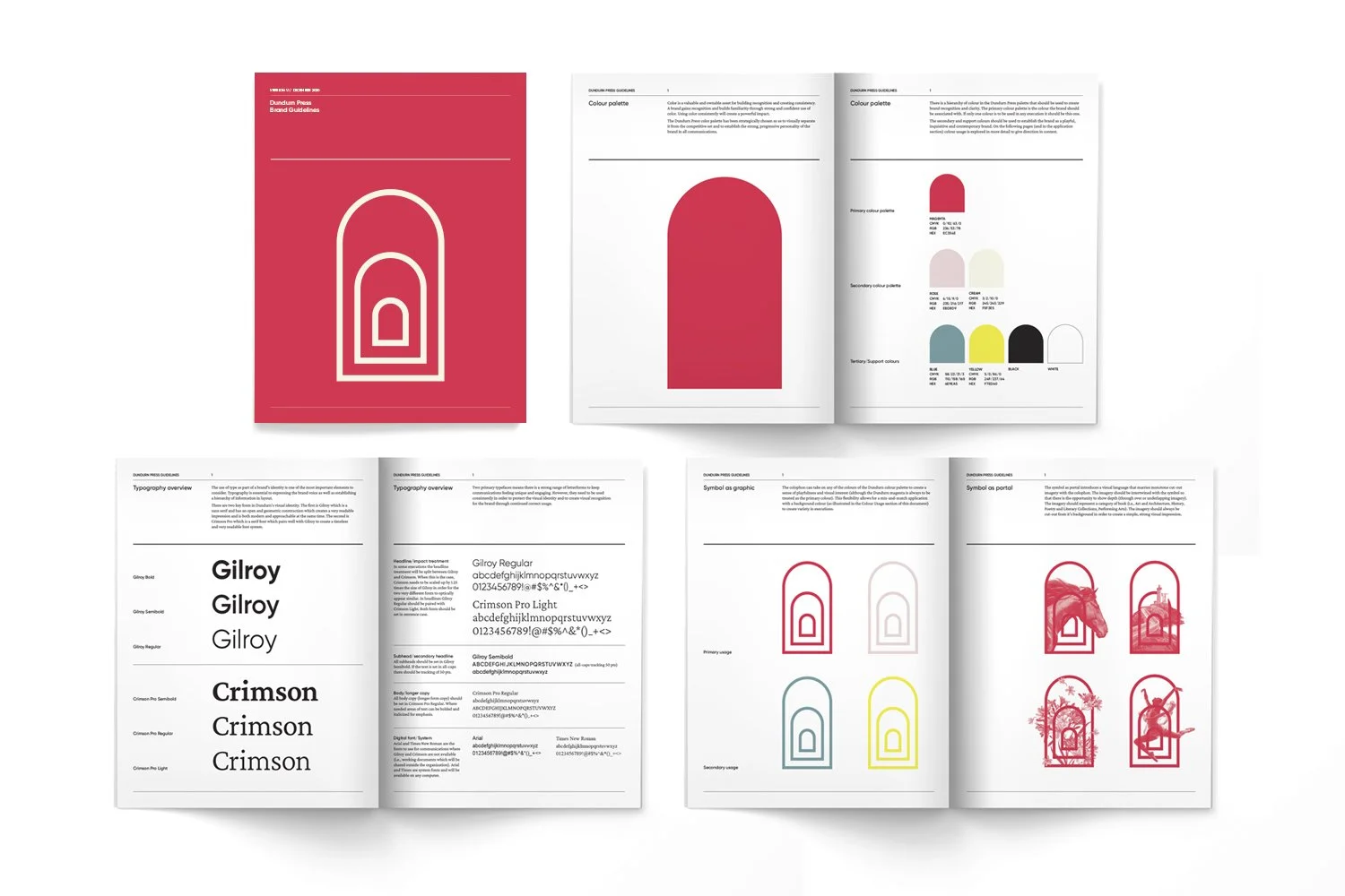 The Dundurn colophon, a signature element of the visual identity, was inspired by the architecture of the Folly from the grounds of the Dundurn Castle in Hamilton, Ontario. Using a repeated key architectural feature the result is a portal. This window or keyhole creates a sense of dimension and escapism for the brand that mirrors the mental escape that people enjoy when connecting with a great book. The colophon is the cornerstone of the Dundurn brand and has great flexibility of use in order to be an engaging and memorable element of the visual identity.