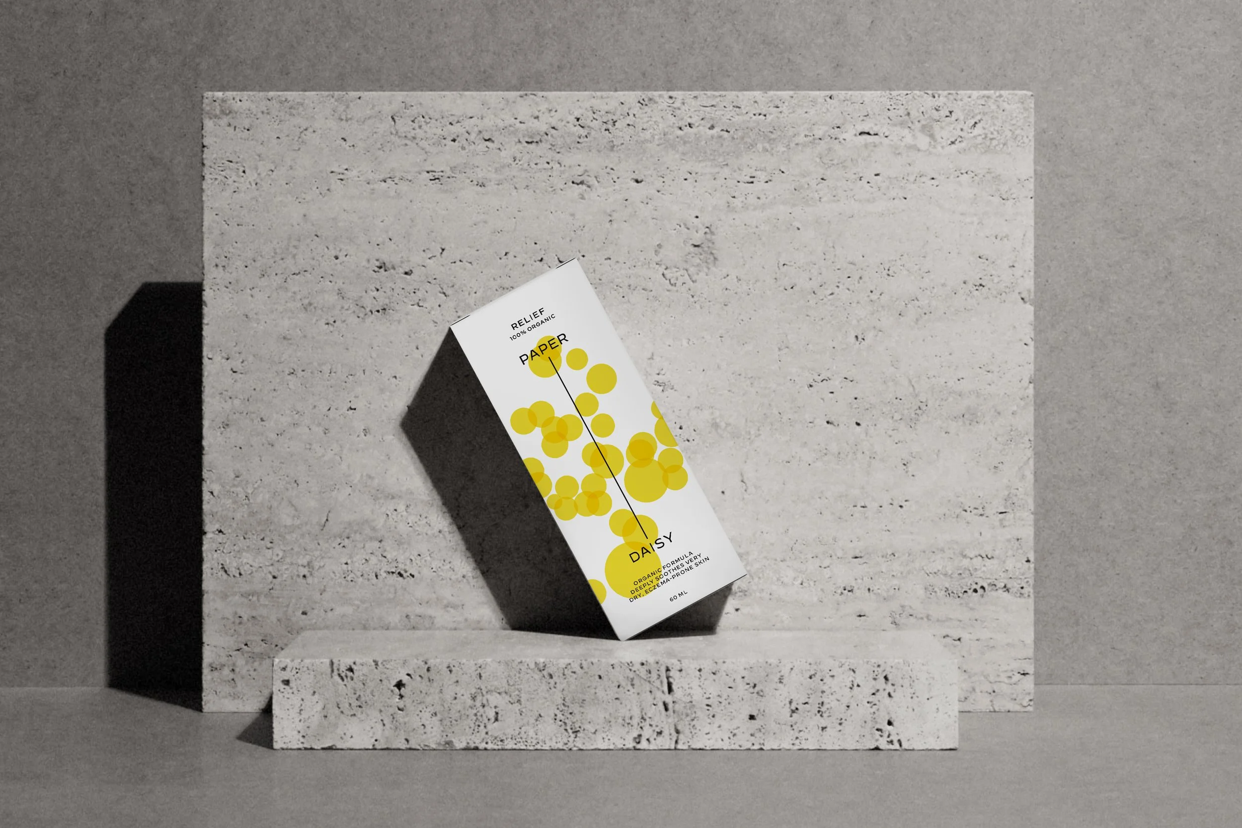 To express this balance, we developed a brand pattern that reduces a field of daisies into a series of overlapping circles. The result evokes both the flower in nature and molecules in a laboratory, visually reinforcing the scientific research behind the product.
